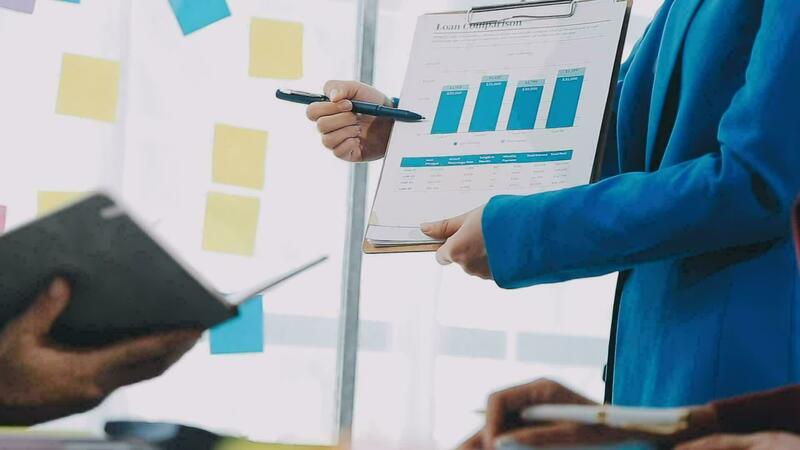Two creative business people meeting and planning use post it notes sticky note on desk to share idea, Analysis data chart and graph with teamwork strategy brainstorming in office. Free Video