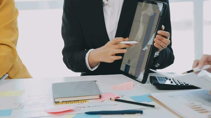 Two creative business people meeting and planning use post it notes sticky note on desk to share idea, Analysis data chart and graph with teamwork strategy brainstorming in office. Free Video