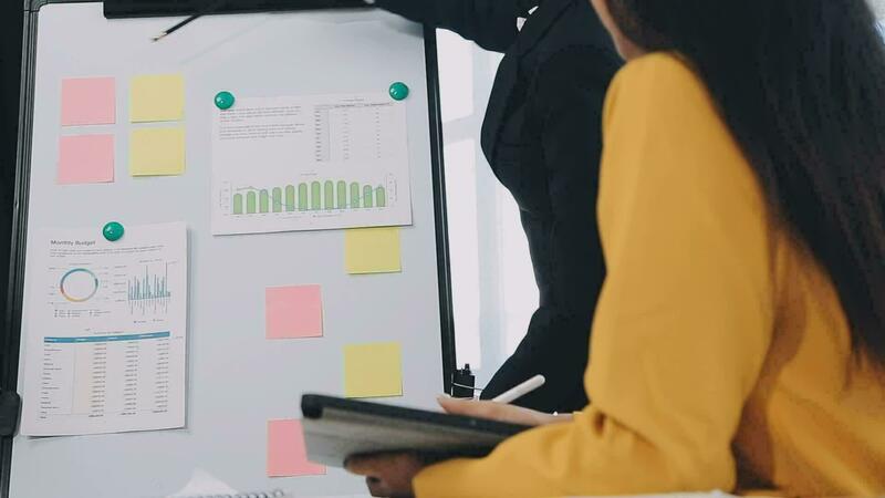 Two creative business people meeting and planning use post it notes sticky note on desk to share idea, Analysis data chart and graph with teamwork strategy brainstorming in office. Free Video
