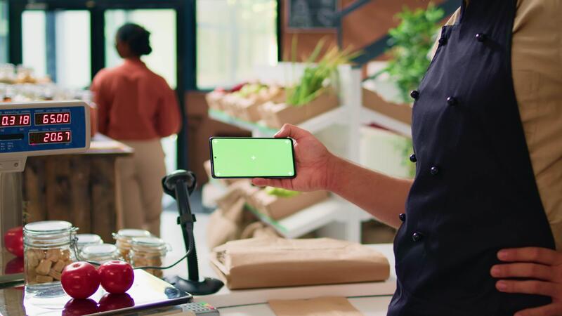 Merchant with phone greenscreen at store counter, presenting isolated chromakey display on mobile gadget. Farmer and vendor using modern copyspace template with mockup technology. Pro Video