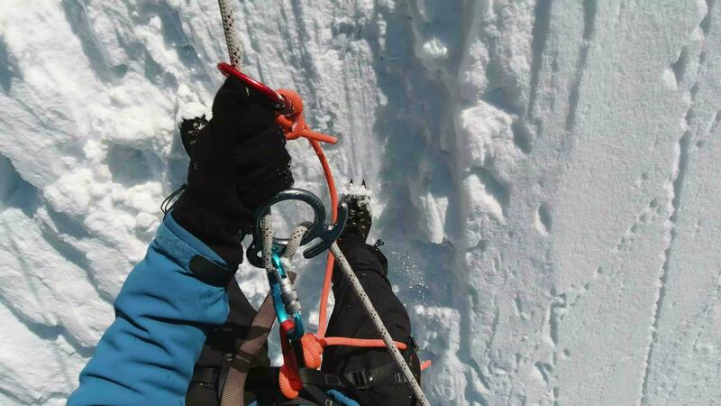 Alpinist Man in Crampons is Using Figure of Eight, Abseiling on Fixed Rope. Fpv View. Slow Motion Pro Video