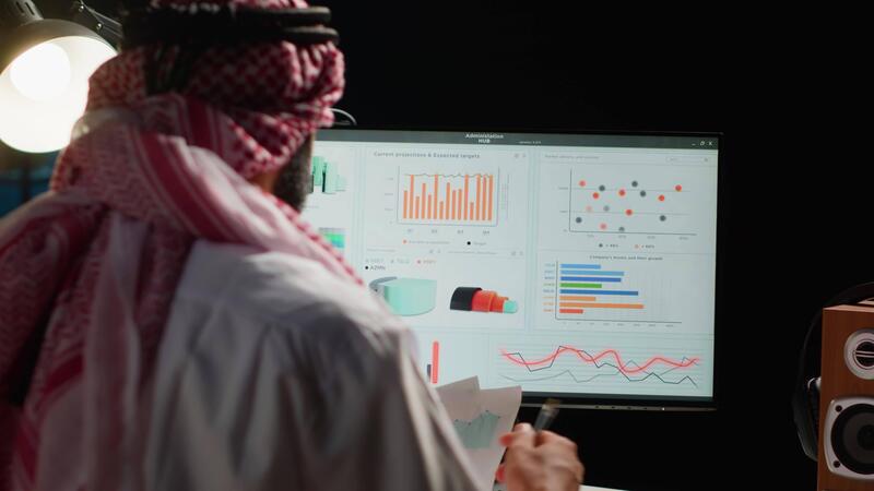 Focused businessman checking analytics statistical data set while remotely working in apartment office. Company executive optimizing key performance indicators, close up shot Pro Video