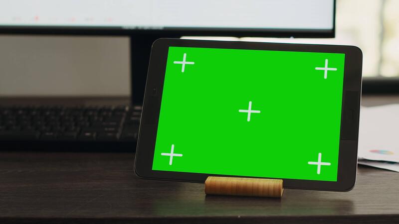 Empty desk with greenscreen on tablet in business coworking space, isolated copyspace layout on modern gadget display. Workstation with device showing chromakey mockup screen. Pro Video