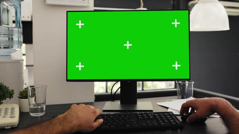 POV of young man at office desk checking greenscreen and isolated chromakey template, solving business operations. Manager sitting at desk looking at blank mockup display. Tripod shot. Pro Video