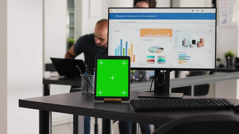 Empty desk with greenscreen tablet and computer running operational data, coworking space for business tasks. Computer desktop at workstation with blank chromakey mockup software on gadget. Pro Video