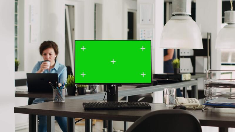 Monitor with greenscreen on empty desk in modern coworking space, pc showing isolated mockup template with copyspace. Device with chromakey display used for small business operations. Tripod shot. Pro Video