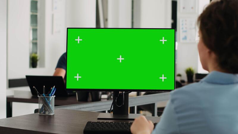 Manager working with isolated greenscreen on computer at workstation, looking at chromakey display with mockup template on desk. Businesswoman using pc in coworking space. Pro Video