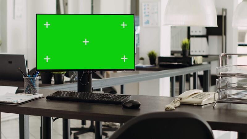 Greenscreen desktop in coworking space pc placed on workstation, open floor plan business office. Computer monitor showing isolated chromakey template with blank mockup display. Pro Video