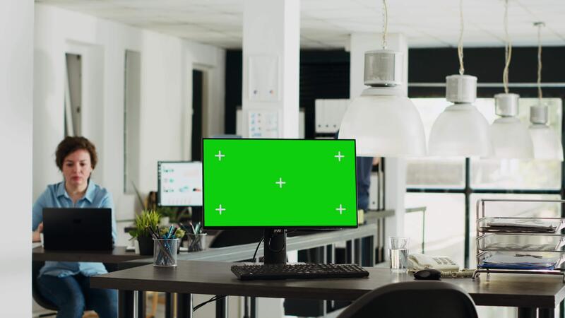 Workstation displaying greenscreen layout with copyspace on monitor at empty desk in urban coworking space. Chromakey display equipment adopted in smaller company operations. Tripod shot. Pro Video