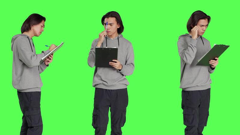 Young man taking notes and thinking about ideas to write on clipboard papers, using files for inspiration in studio. Adult being thoughtful and in doubt, writing information on camera. Pro Video
