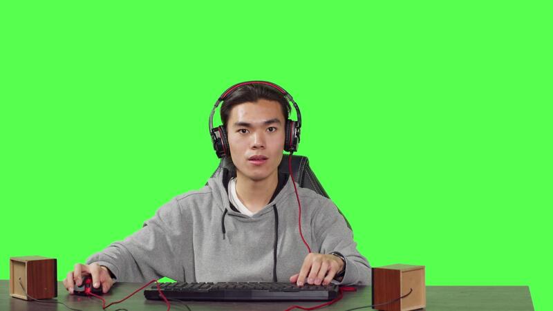 POV of asian guy enjoying computer games at desk while positioned against greenscreen backdrop. Player has fun with friends online in gaming tournament, using headphones at desktop. Pro Video