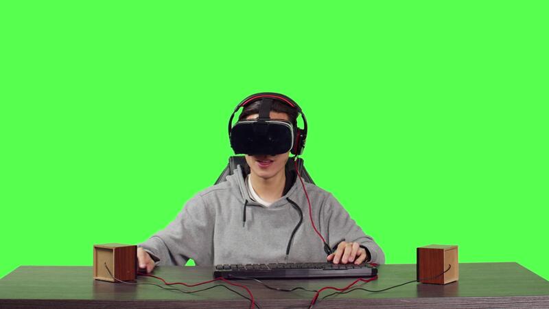 POV of player enjoying vr video games sitting at his desk over greenscreen backdrop, playing web based with friends and having fun with rpg gameplay. Man using virtual reality headgear. Pro Video