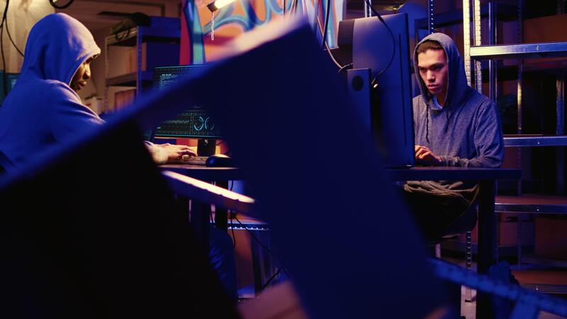 Panning shot of hackers working hard on writing lines of code on hideout computers, trying all methods of getting past security systems. Professional scammers building scripts that can hack devices Pro Video