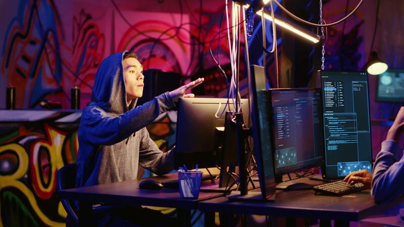 New member in hacking group asking mentor for help in underground hideout. Script kiddie requesting assistance with virus development from master hacker in graffiti painted base Pro Video