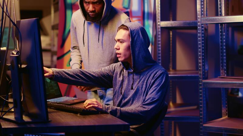 Evil cybercriminals in neon lit hidden base targeting vulnerable unpatched connections, brainstorming methods of getting past computer defenses and stealing valuable sensitive data Pro Video