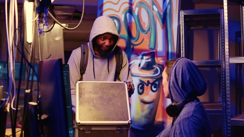 African american hacker in secret underground base excited to show colleague SSD with finished spyware virus they will use to gather data from users computers without their knowledge Pro Video