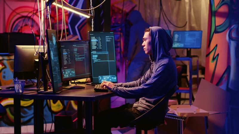 Evil hackers doing data breaches and financial theft in graffiti painted hideout. Rogue programmers stealing users bank account credentials, targeting low security passwords Pro Video
