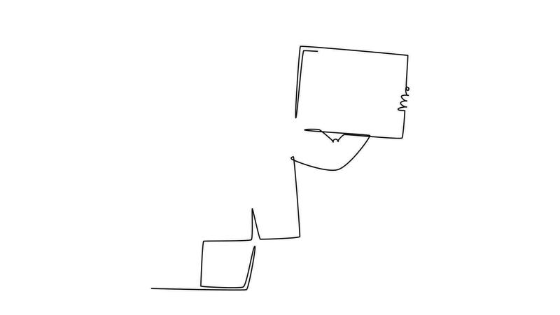 Animated self drawing of continuous line draw of young male presenter giving instruction using little blackboard while meeting at office. Work presentation concept. Full length single line animation Pro Video