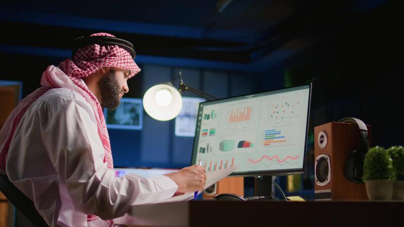 Muslim teleworker checking analytics statistical data set while remotely working in apartment office. Management executive optimizing key performance indicators with tv as background noise Pro Video