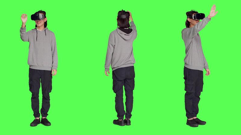 Young adult enjoys virtual reality gadget in studio with greenscreen background, using interactive vision or simulation on headset. Modern guy having fun with artificial intelligence vr glasses. Pro Video