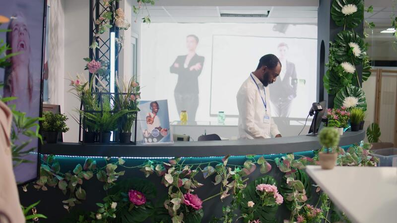 BIPOC retail clerk checking past customers transactions in thrift shop at checkout counter and taking clothes delivery orders. Store manager in empty SH store looking at data on terminal screen Pro Video