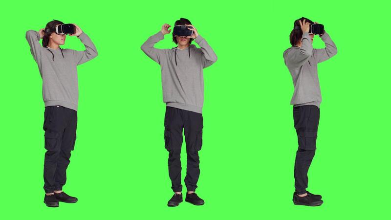 Young guy uses virtual reality tech on camera with full body greenscreen template, using interactive 3d vision on vr glasses. Modern person having fun with artificial intelligence headset. Pro Video
