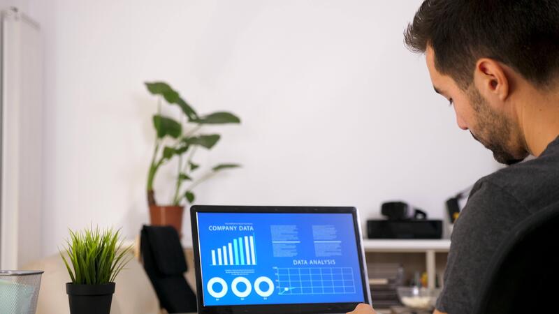 Man in living room looking at animated data analysis chart on computer screen. Back view. Dolly slider 4K footage Pro Video