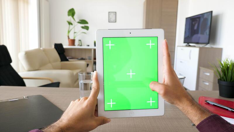 Firts person point of view of male hands holding a digital tablet PC in hands with green screen chroma mock up in vertical position. Dolly slider 4K footage with parallax effect Pro Video