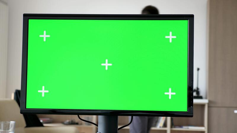 Modern Personal computer with big screen chroma mock up on the desk in living room. A man is entering the room in the background and sits on the couch while looking at his phone. Dolly slider 4K footage with parallax effect Pro Video