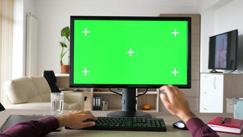 First person view man hands typing on computer keyboard with big green screen chroma mockup. The PC is on the desk in living room and the TV is on in the background Pro Video