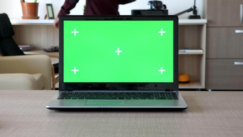 Zoom in on a notebook with isolated green screen and markers for tracking in an apartment. A person is walking in the background and sits on the sofa looking in his smartphone Pro Video