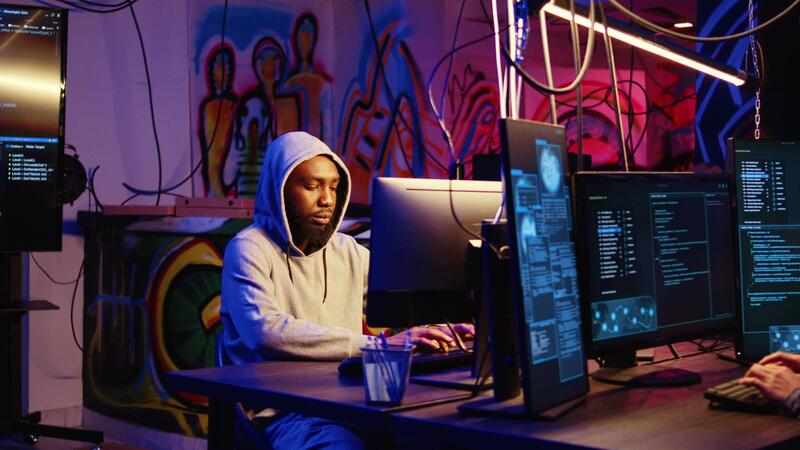 Close up shot of african american man hacking systems, stealing credit card numbers and manipulating banking systems for his own personal gain. Zoom in on evil hacker running code in basement Pro Video