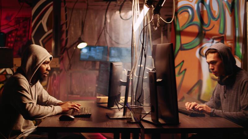 Hackers rushing to evade underground HQ after hearing policemen coming to arrest them for coding malware designed to exploit network backdoors, running to not get caught by cops Pro Video
