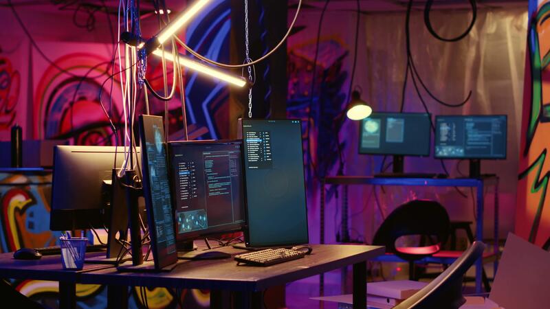 Programming language on PC screens in empty messy hackers base of operations with grunge graffiti drawings sprayed on walls. Neon lit ghetto hideout used by criminals to commit illegal activities Pro Video