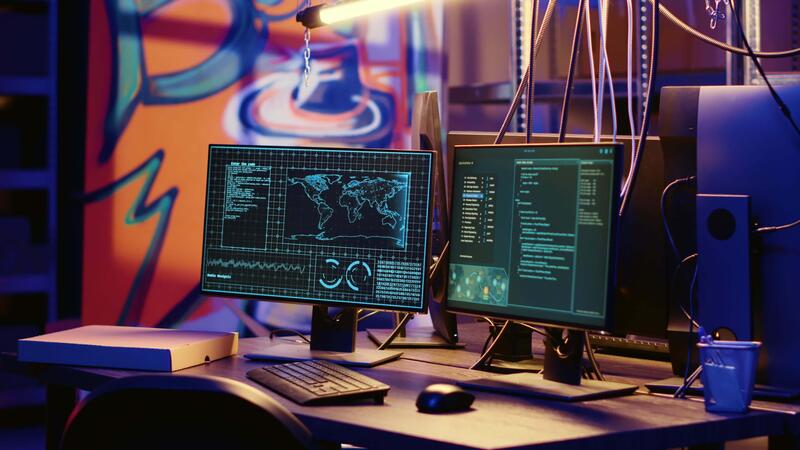 High tech computer system in hidden underground base used for international espionage. PC equipment used for intercepting soundwaves in empty hideout with graffiti painted walls Pro Video