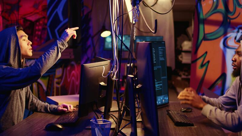 Zoom out shot of malicious men hacking, stealing credit card numbers and manipulating banking systems for their own personal gain. Evil hackers running code in graffiti painted basement Pro Video