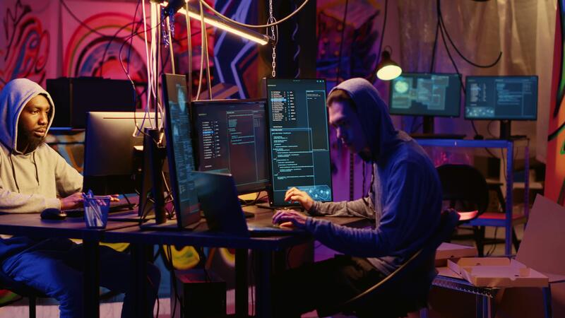 Beginner hacker requesting help from experienced cybercriminal, learning how to destroy firewalls and infect victim computer. Cracker in secret hideout teaches script kiddie how to write malware code Pro Video