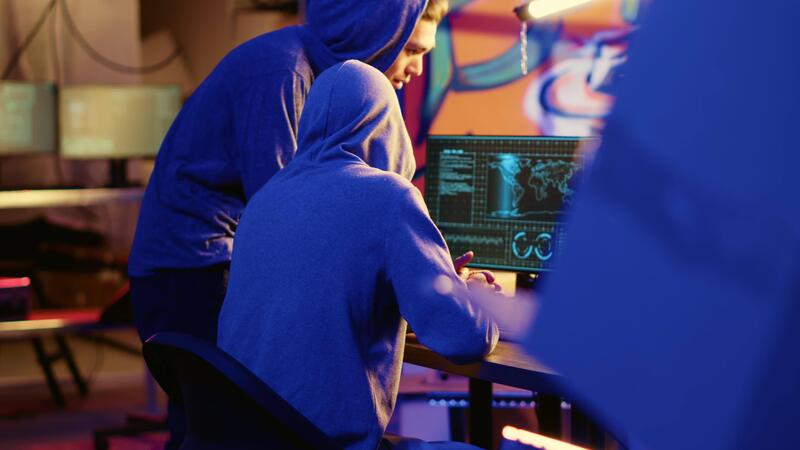Hacking group founder initiating new member, showing him how to destroy firewalls and infect victim computer in hideout. Evil cybersecurity guru teaches script kiddie how to write malware code Pro Video