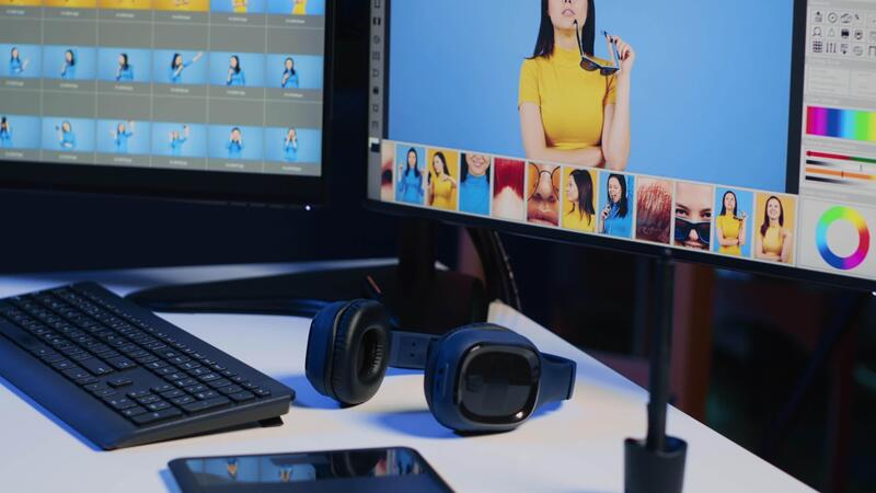 Photo retouching software interface on computer in empty photography studio, close up. Photography organizing program displayed on multi monitors PC setup on multimedia company desk, panning shot Pro Video