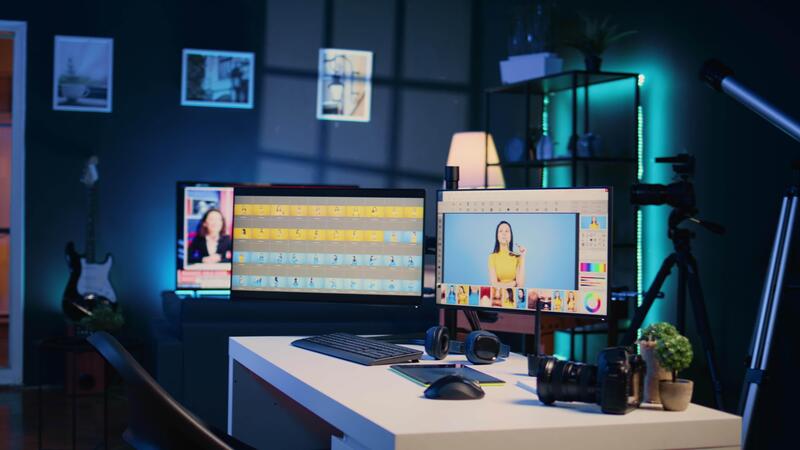 Photo retouching software interface on computer in empty freelancing apartment studio. Photography organizing program displayed on multi monitors PC setup in personal office, panning shot Pro Video