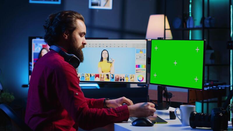 Content specialist using graphic design skills to make social media post on green screen computer for advertising company. Photo editor using chroma key PC monitor to create promotional image Pro Video