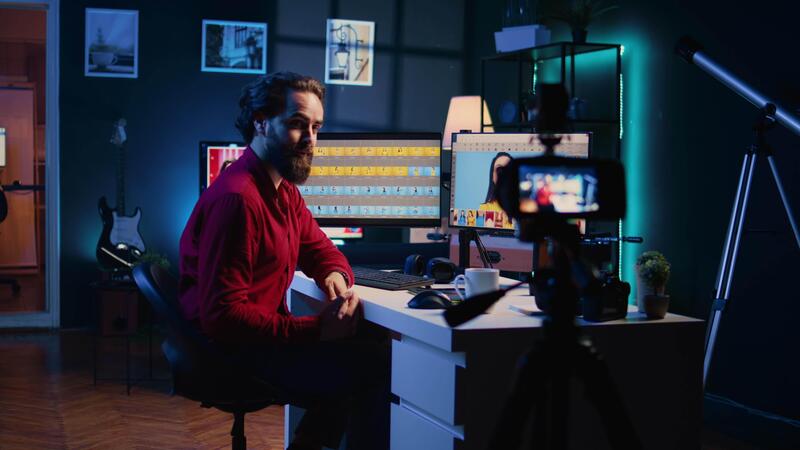 Photographer filming online tutorial for niche audience on how to use photo editing software, teaching how to navigate menus, recording with professional camera in apartment studio Pro Video