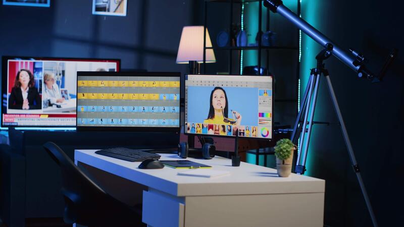 Photo processing software interface on computer screens in creative agency studio, panning shot. Image editing program UI displayed on multi monitors PC setup in photographer workspace Pro Video