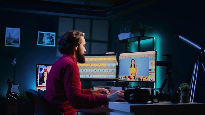 Photo editor retouching photographs with editing software in high tech virtual reality application. Photographer browsing through photoshoot images using futuristic VR technology headset Pro Video