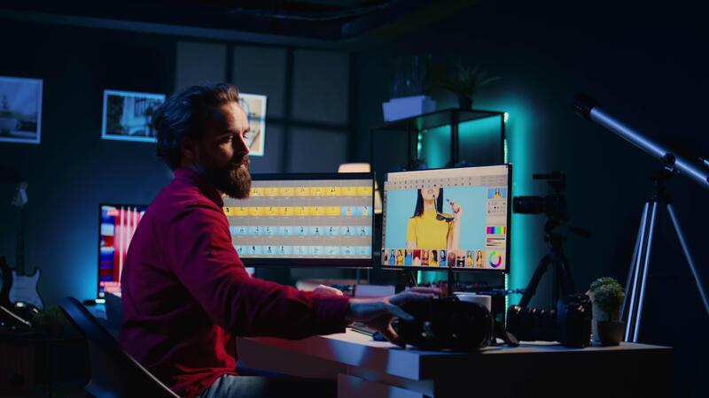 Photo editor using virtual reality technology to browse through photoshoot images to find and fix faulty spots. Photographer editing pictures with high tech VR headset device Pro Video