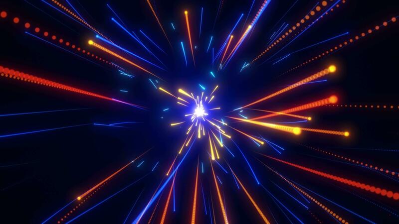 Moving dynamic light stripes on a dark background. Particle explosion. speed of light, fireworks from dots and particles, space scene, futuristic background. Seamless loop 4k video. Pro Video
