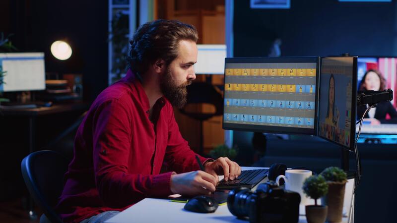 Photo editor retouching photographs with editing software on desktop computer, browsing through photoshoot stills to find images that need correcting. Photographer in home office adjusting images Pro Video