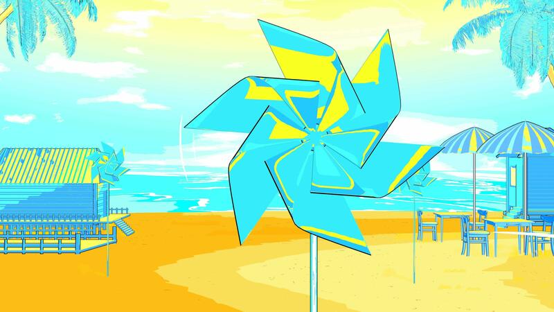 Animation of a paper windmill spinning in the wind, with a view on a beach in stylized toon shader. 4k Free Video