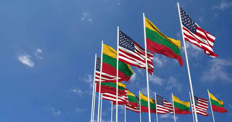 United States and Lithuania Flags Waving Together in the Sky, Seamless Loop in Wind, Space on Left Side for Design or Information, 3D Rendering Free Video