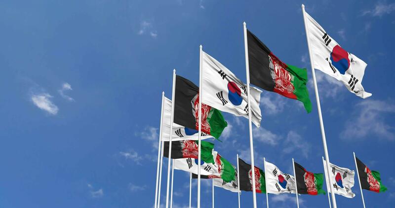 Afghanistan and South Korea Flags Waving Together in the Sky, Seamless Loop in Wind, Space on Left Side for Design or Information, 3D Rendering Free Video